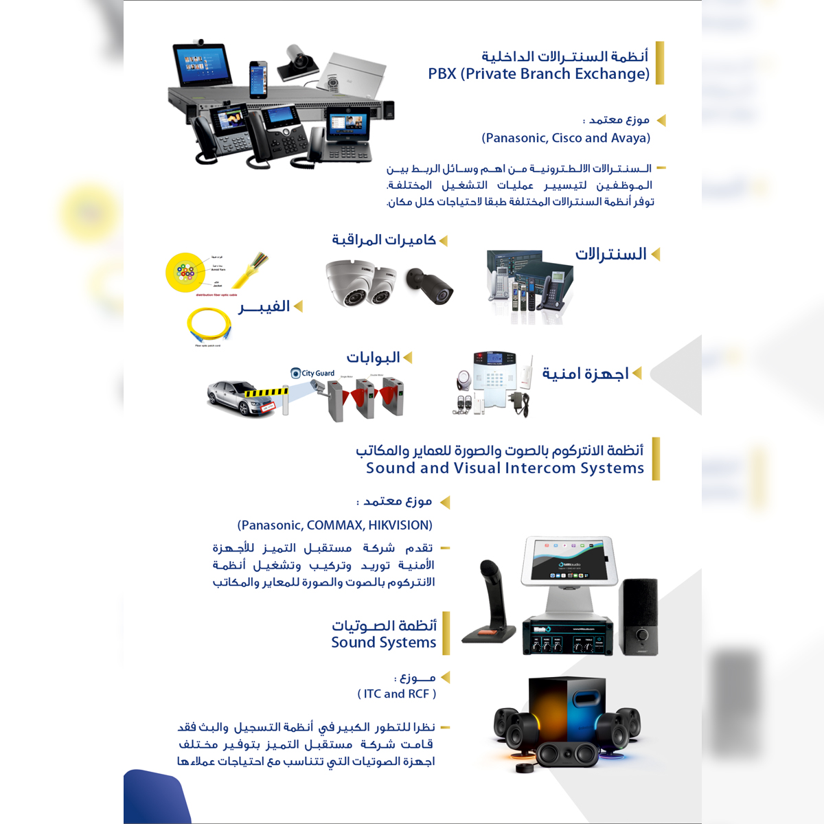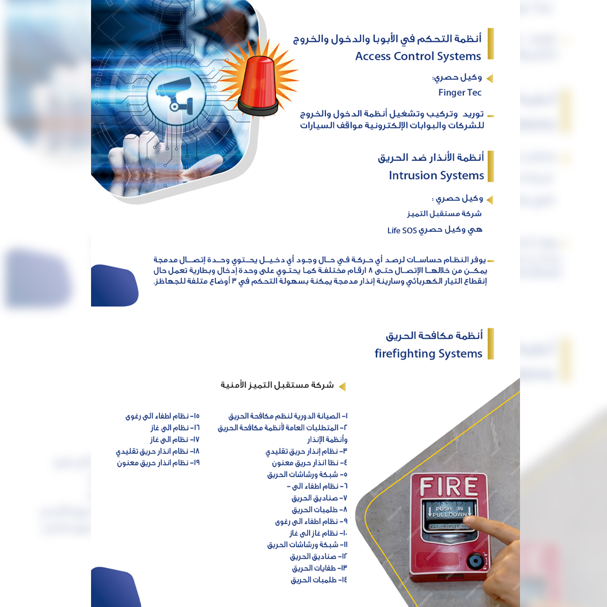 أنظمة الإنذار ضد الحريق : يوفر النظام حساسات لرصد أي حركة في حال وجود أي دخيل يحتوي على وحدة اتصال مدمجة يمكن من خلالها الاتصال حتى 8 ارقام مختلفة كما يحتوي على وحدة ادخال وبطارية تعمل حال انقطاع التيار الكهربائي وسارينة انذار مدمجة يمكنه بسهولة التجكم في 3 أوضاع مختلفة للجهاز.